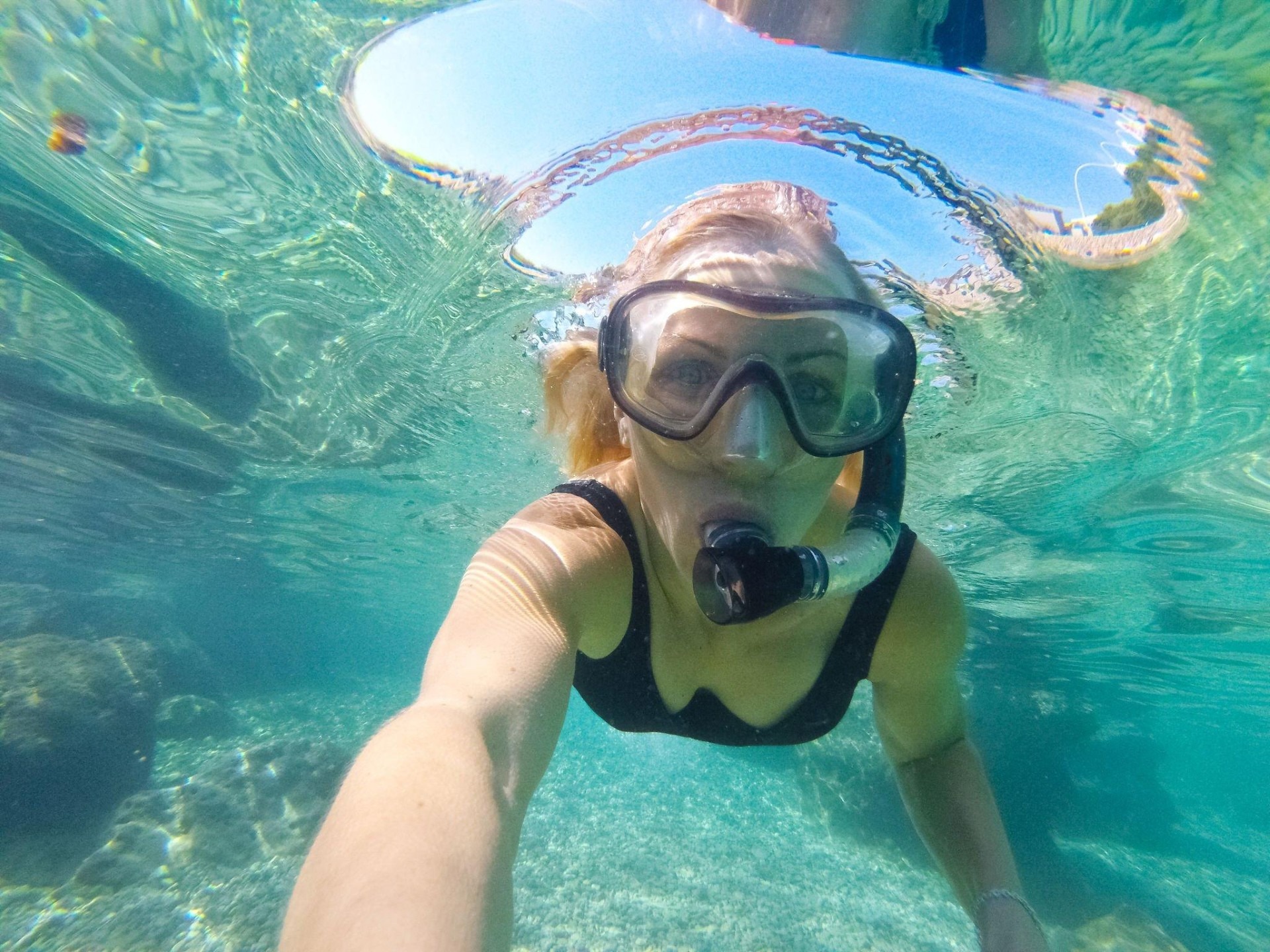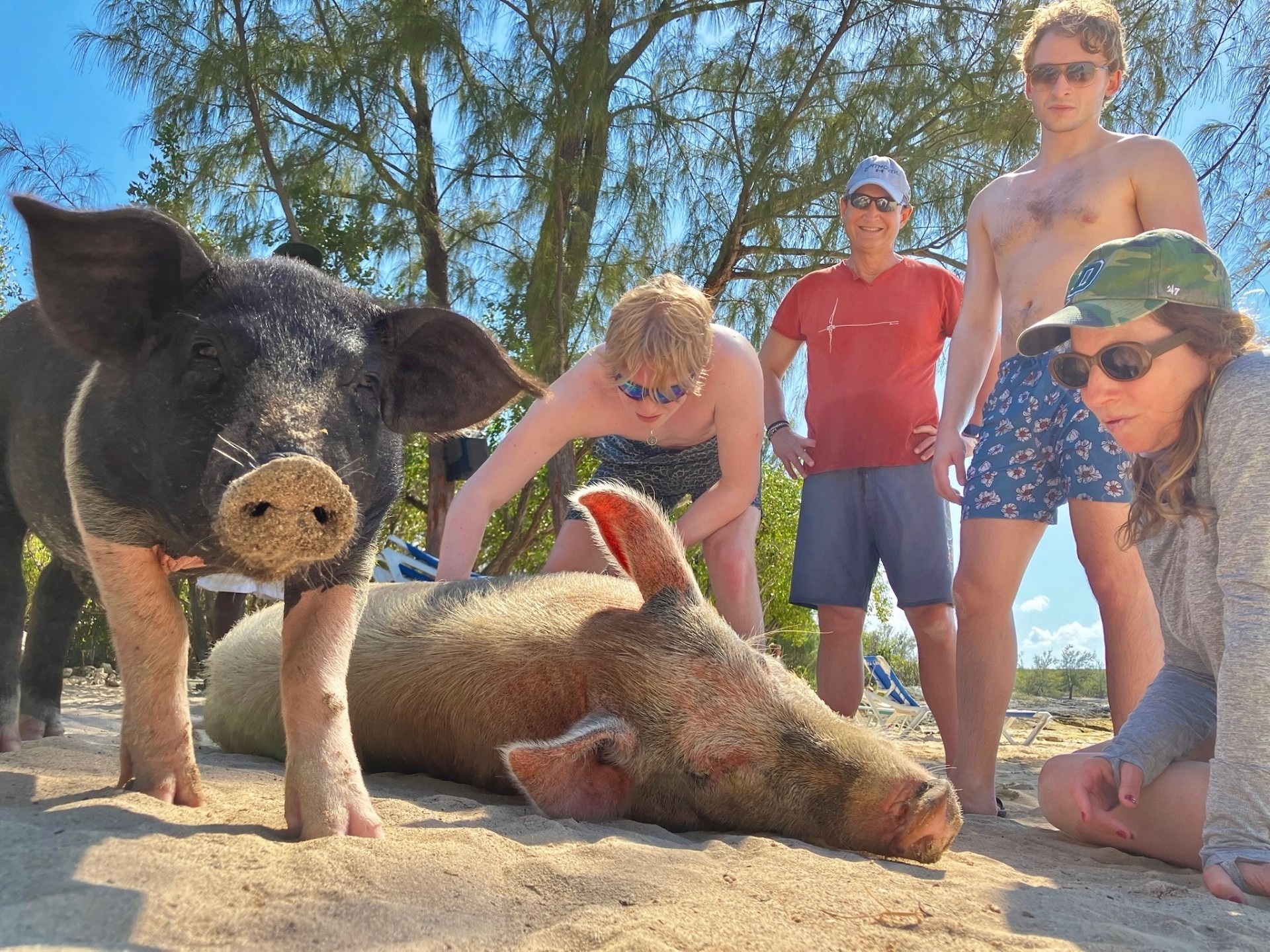 The water at the beach on Rose Island is relatively shallow, usually around waist-deep or less. This makes it easy and safe to swim with the pigs.